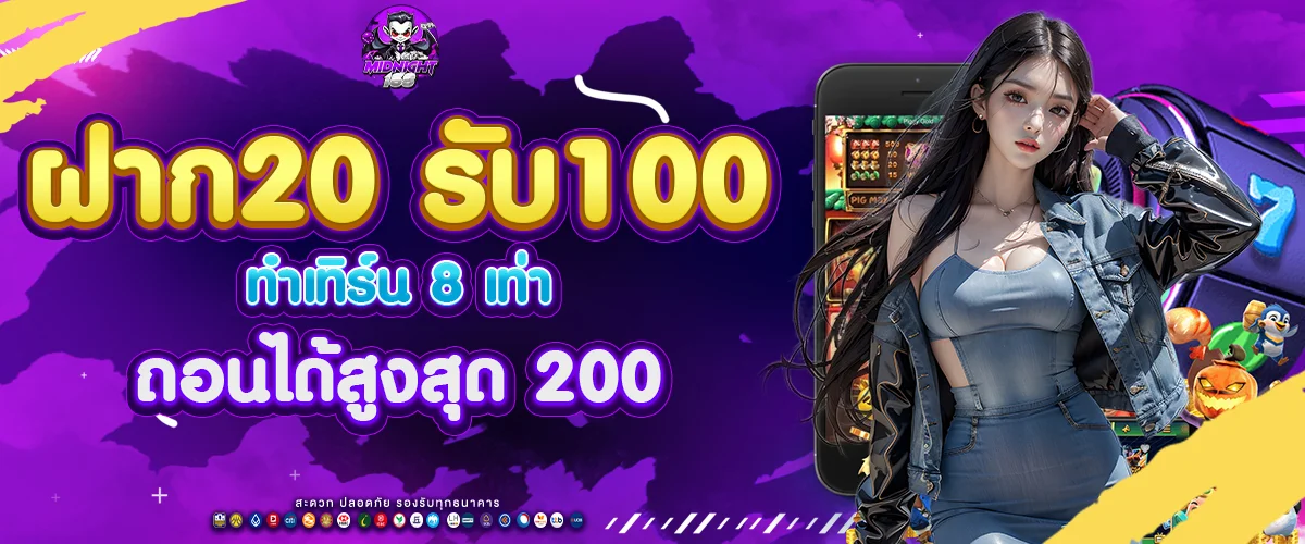 ฝาก 20 → รับเพิ่ม 80 = รวม 100 / ทำเทิร์น 8 เท่า / ถอนได้สูงสุด 200